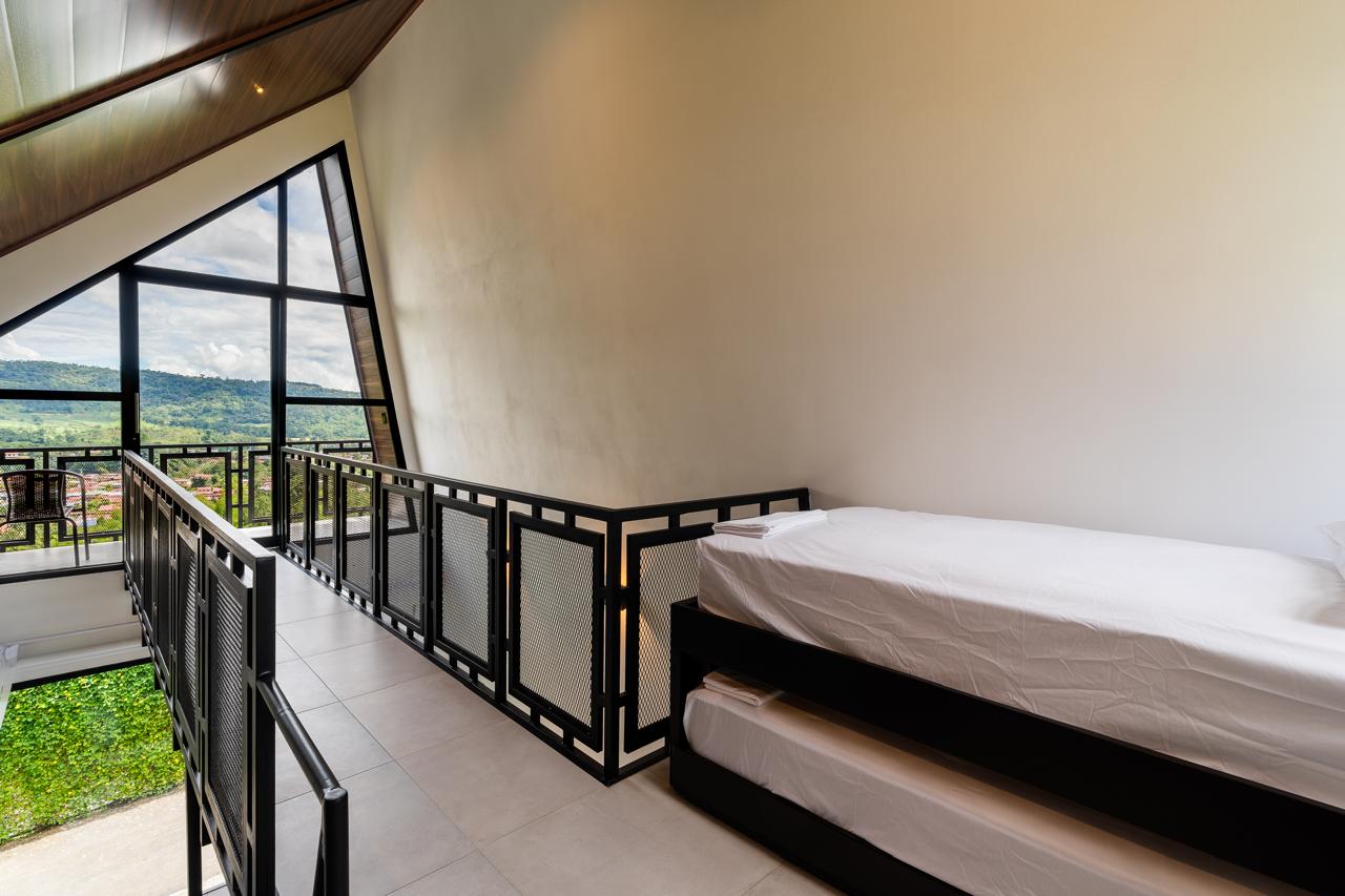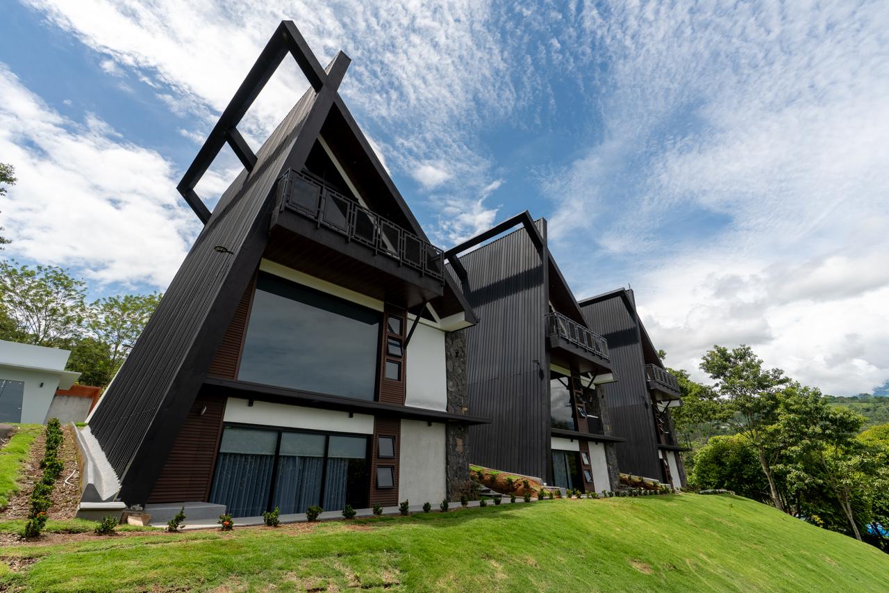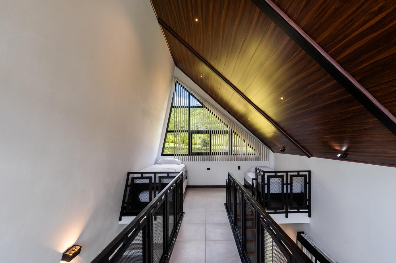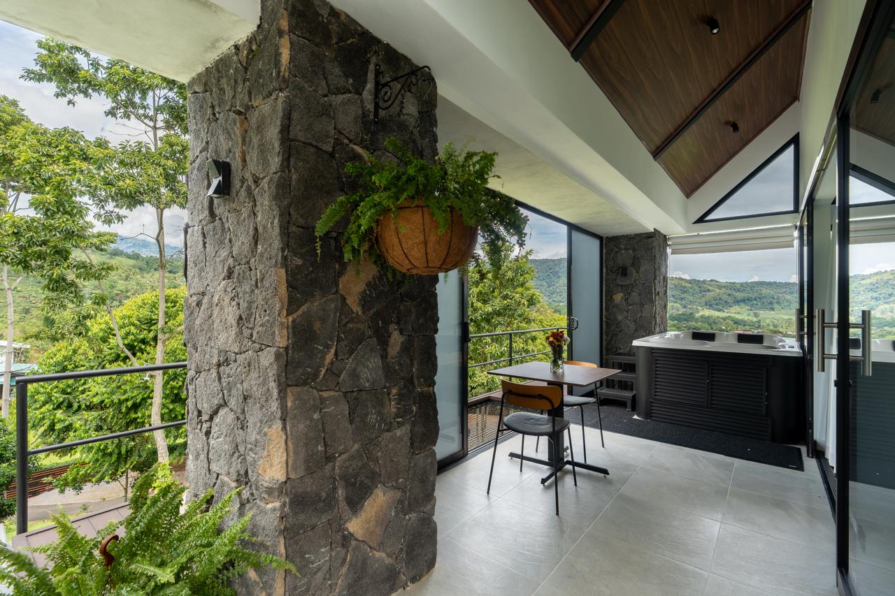 3 Chalets Deluxe Plus, con un diseño arquitectónico fuera de lo convencional, con capacidad de hasta 5 personas; equipados con: 1 cama king y 3 camas individuales. Cada unidad cuenta con aire acondicionado, jacuzzi, proyector, cocina totalmente equipada, un sistema de control inteligente mediante Alexa y un balcón con las mejores vistas al volcán y al valle de Turrialba, perfectos para una estancia de lujo en un entorno natural incomparable. El hospedaje incluye desayuno a la carta.
